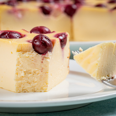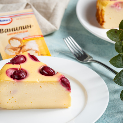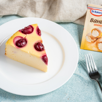 Нежная творожная запеканка с ароматом ванили и вишней напоминает по вкусу чизкейк и просто тает во рту.