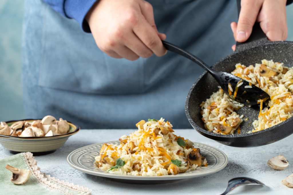 Рис с грибами образует великолепное сочетание, которое обязательно оценят все члены вашей семьи.