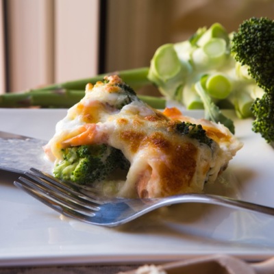 В жидкую смесь добавить брокколи и лосось и все аккуратно перемешать.