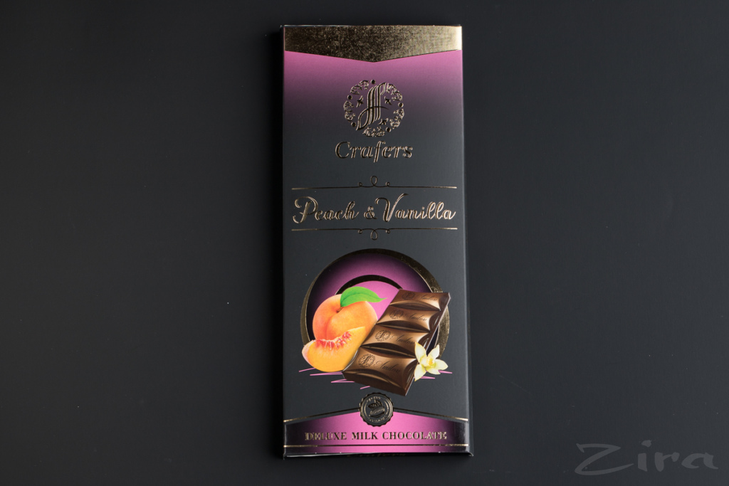 «Peach&Vanilla» sutli shokoladi mayin, silliq va yoqimli kakao ta’miga ega bo’lib, og’izda darrov erib ketmaydi.