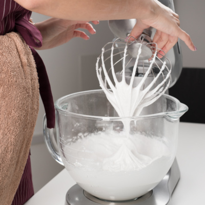 Tuxum oqi qo'lda yoki mikser yordamida o'rta darajada oq ko'pik hosil bo'lgunicha ko'pirtiriladi.