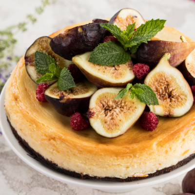Tayyor bo'lgan chizkeykni sovutib, 6 soatga sovutgichga olib qo'yamiz. Tortishdan oldin chizkeyk ustini ikkiga bo'lingan anjirlar bilan bezatib chiqamiz.