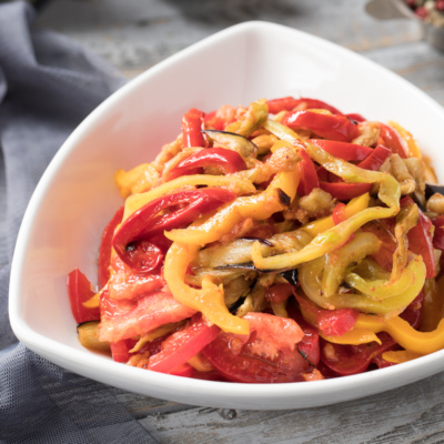 Tog'orachaga baqlajon, bulg'or qalampiri, pomidor, sarimsoqpiyoz va ziravorlarni solib aralashtirib olamiz.