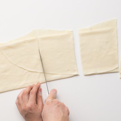 Xamirni olib yoyamiz va to'rtburchak shaklda kesib chiqamiz.