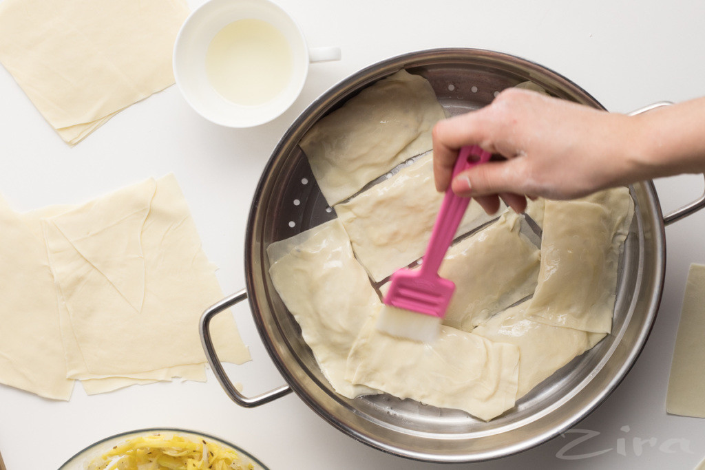 Kesilgan xamirchalarga asosni solib chiqamiz va chetini yopishtiramiz.