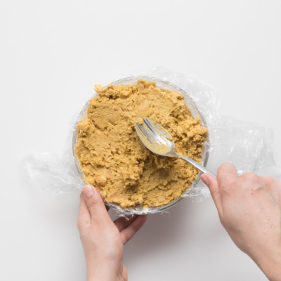 Kichikroq qolip yoki tog'oracha olib ostidan kattaroq yelim qog'oz to'shaymiz va ustidan pechenyeli aralashmani solamiz.