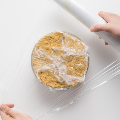 Qoshiq yordamida ustini tekislaymiz va ustini ham yelim qog'ozda yopib, ikki soatga sovutgichga qo'yamiz.