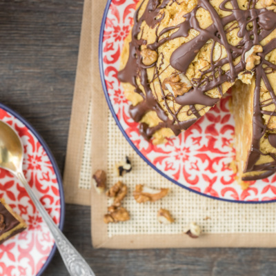Ustini eritilgan shokolad va yong'oq bilan bezatamiz. Yoqimli ishtaha!