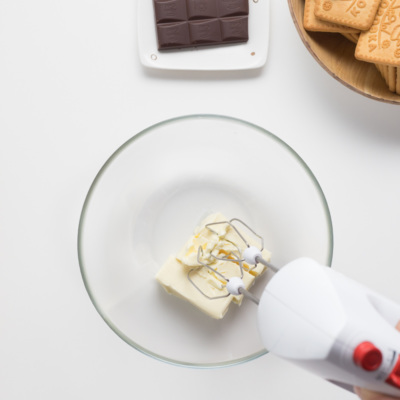 Shokoladni suv bug'ida yoki mikroto'lqinli pechda eritib olamiz.