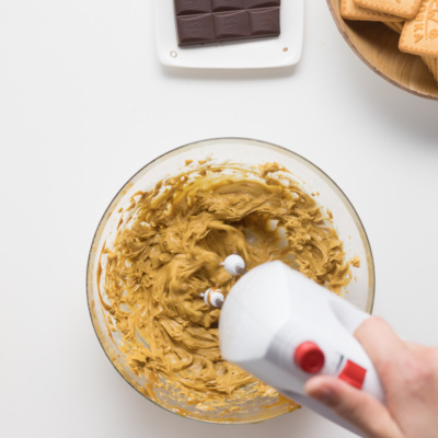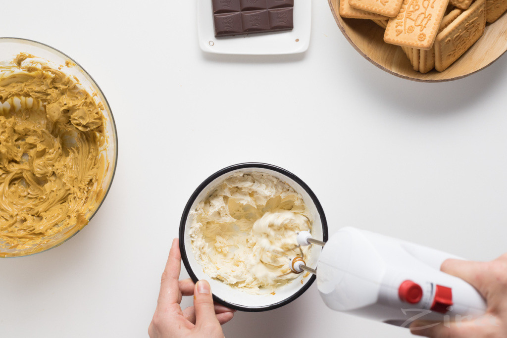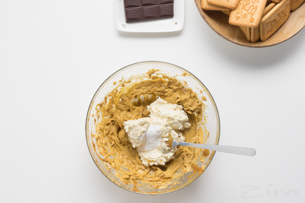 Sariyog'ni mikserda ko'pirtiramiz va oz-ozdan quyultirilgan sut solib, ko'pirtirishda davom etamiz.