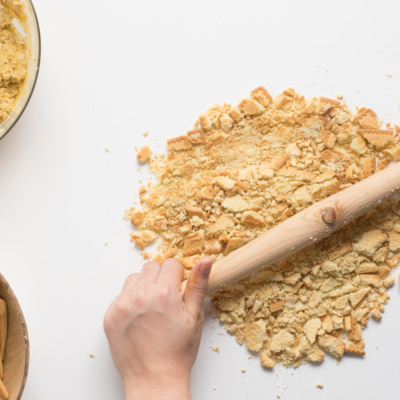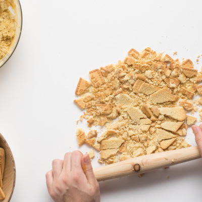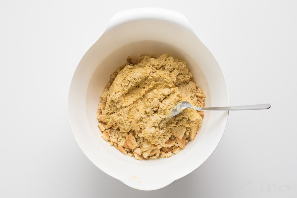 Maydalangan pechenyeni idishga solamiz va ustidan kremni solib yaxshilab aralashtiramiz.
