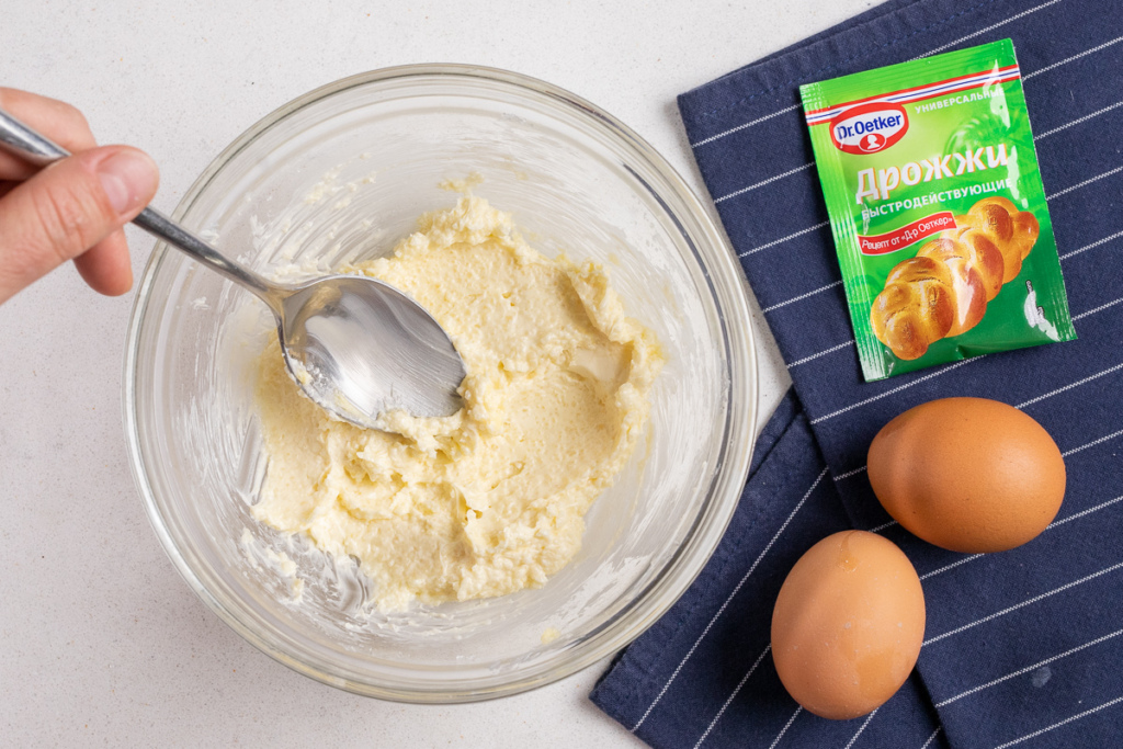 Yog’ni xamirga qo’shib, yana 10 daqiqa davomida qoramiz. Masalliqlar birinchi ajralib ketayotganga o’xshaydi, ammo qorganingiz sari yumshoq va qo’lga yopishmaydigan bo’ladi.