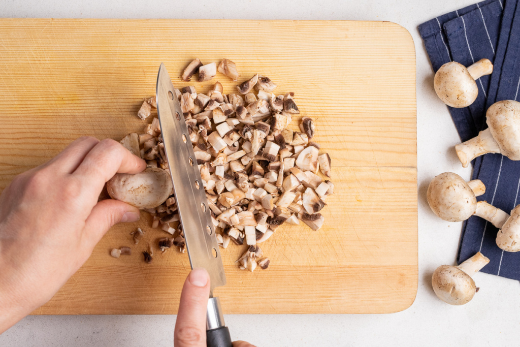 Piyozni tozalab mayda kubik shaklida to’g’raymiz.