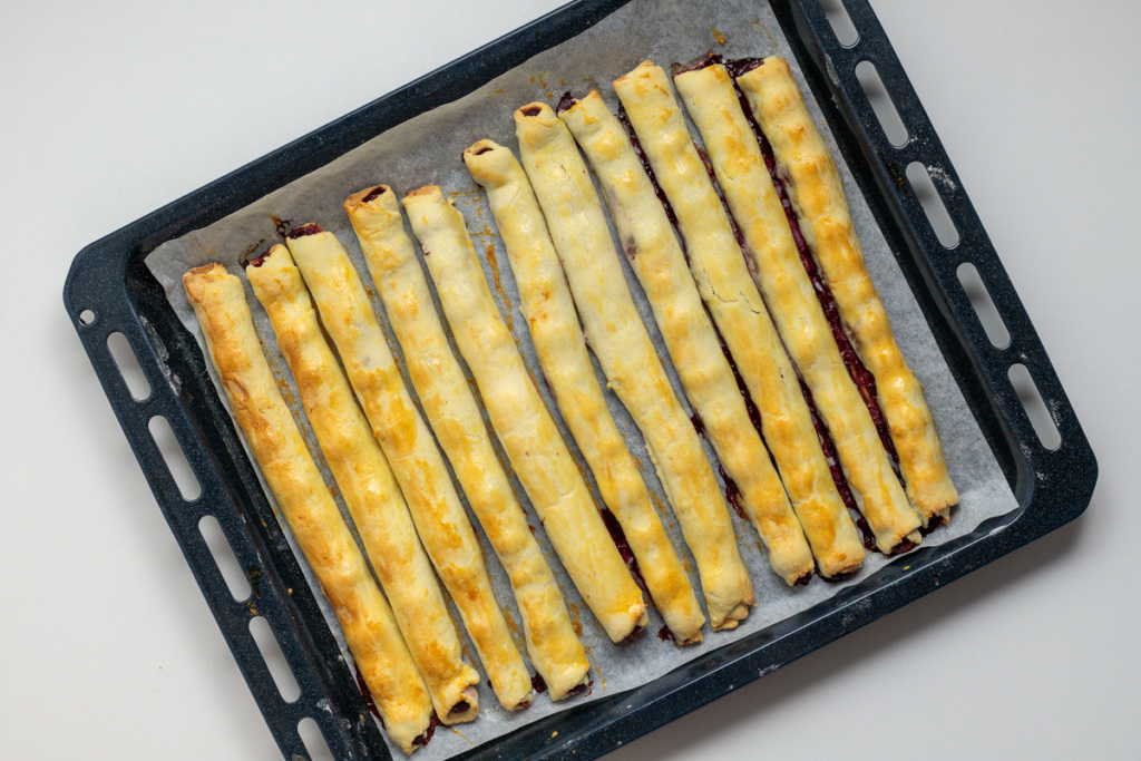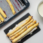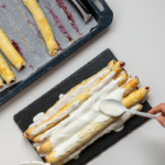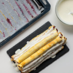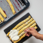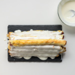 Uzunchoq likopchaga avval 5 dona naychali pishirig'imizni ustidan krem surtamiz.