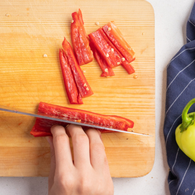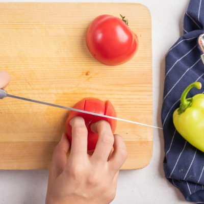 Pomidorni kubik shaklida to’g’raymiz. Bulg’or qalampirini ingichka somoncha shaklida to’g’raymiz.
