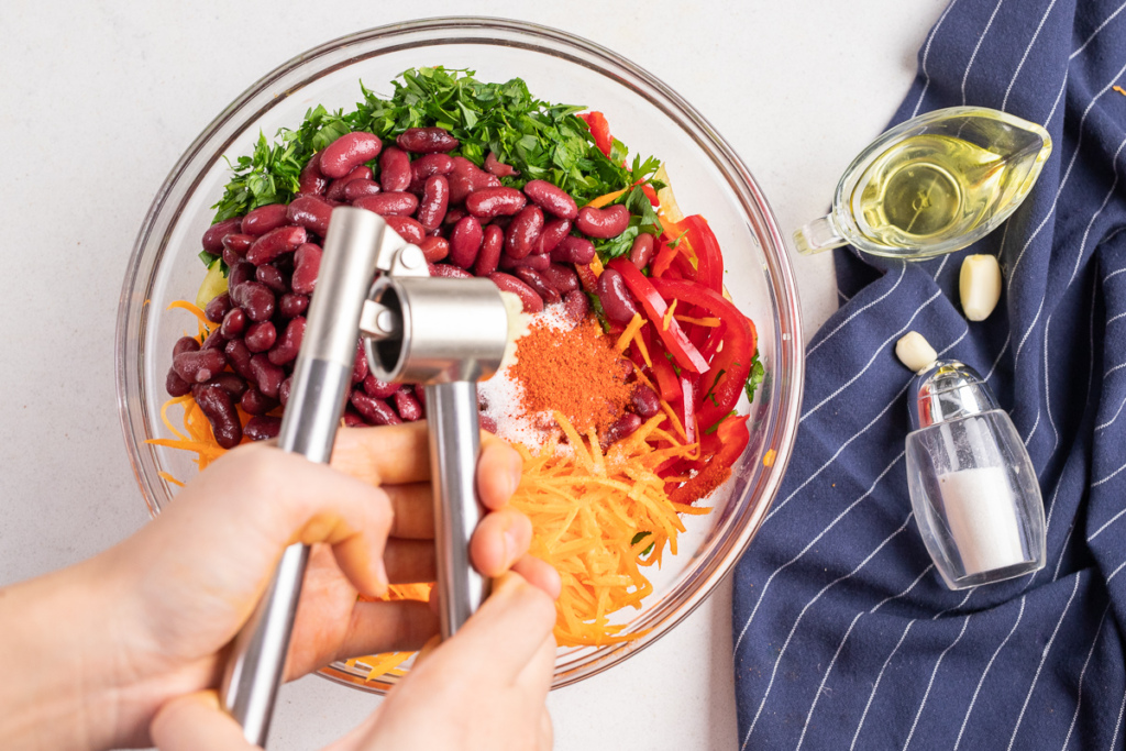 Ko’katni maydalaymiz, sarimsoqpiyozni pressdan chiqaramiz.