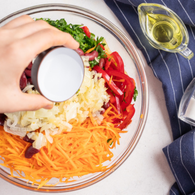 Sirka qo’shib salatni aralashtiramiz.