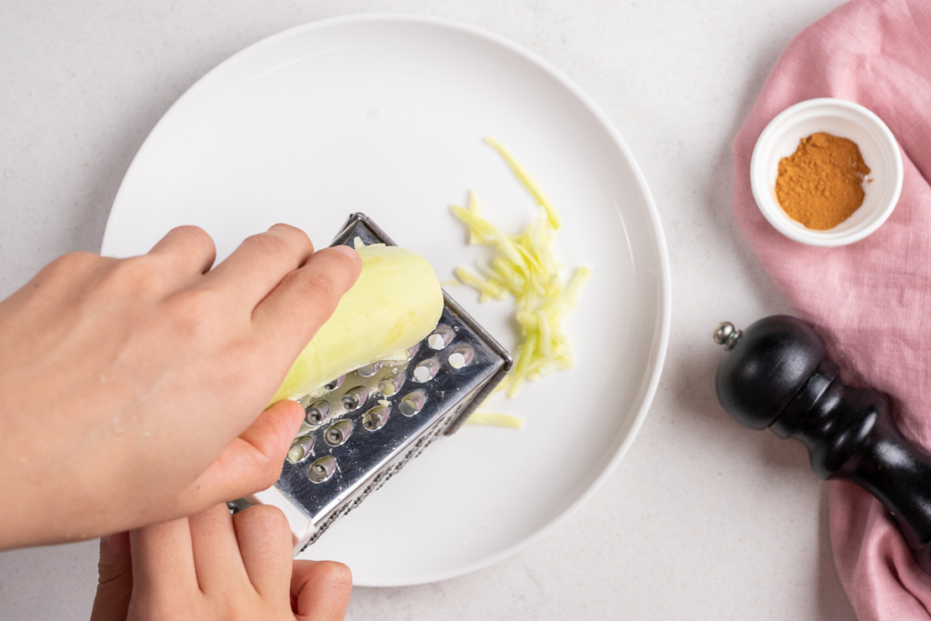 Qovoqchani yirik qirg’ichdan o’tkazamiz. Maffinlar uchun 125 gramm qirg’ichdan o’tkazilgan qovoqcha kerak bo’ladi.