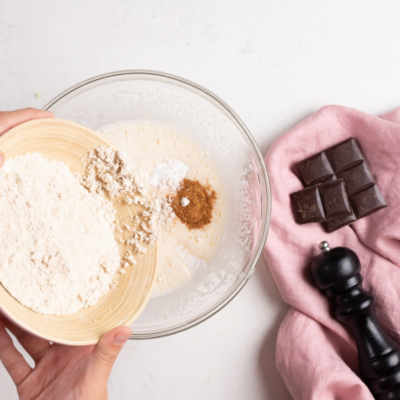 Qabartma, dolchin, soda, suli yormasi uni, qirg’ichdan o’tkazilgan qovoqcha va maydalangan shokoladni qo’shib aralashtiramiz. Istakga ko’ra yong’oq qo’shish mumkin.