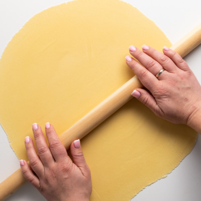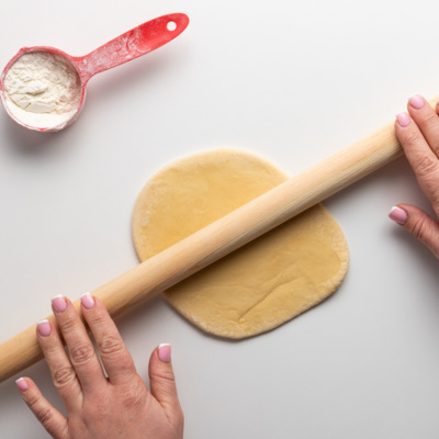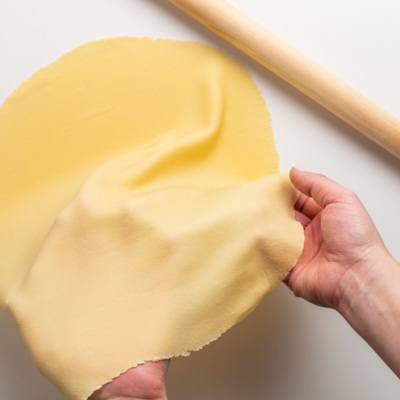 Xamirning ikkita bo'lagini ham alohida-alohida yupqa yoyib olamiz, taxminan 1 mm yupqalikda. Xamirni ostidan kaftingizni qo'ysangiz, u ko'rinib turishi kerak.