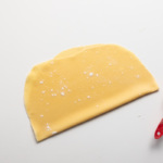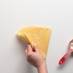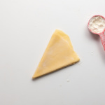 So'ng xamir ustiga ozroq un sepamiz va uni avval teng ikki buklaymiz, so'ng yana ikkiga, ozroq undan sepib, yana bir buklasak ko'p qavatli uchburchak shakl hosil bo'ladi.