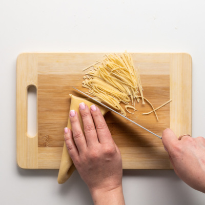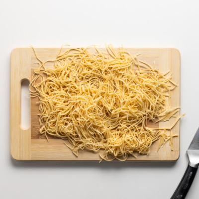 Endi o'tkirroq pichoq bilan lapshaning chetki qismidan uchiga qaratib, yupqa qilib kesib chiqing. Lapsha qanchalik yupqa bo'lsa, shunchalik shirin chiqadi deyishadi.