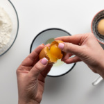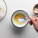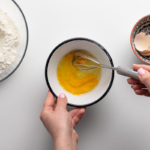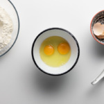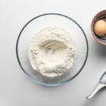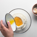 Tog'orachaga unni solib, o'rtasini chuqurcha qilib olamiz. Tuxumlarni alohida idishga chaqib solamiz va tuz sepib aralashtiramiz. Unning ustidan solamiz.