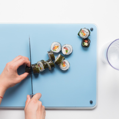 Bodring, kolbasa, qisqichbaqa tayoqchalari va qizil baliqni uzunchoq shaklda kesib chiqamiz. Qalinligi 7 mm dan oshmasin. Ko'k piyozni ham teng o'rtasidan bo'lamiz.