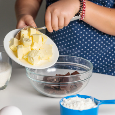 Idishga shokoladni bo'lakchalarga bo'lib, solamiz. Ustidan to'rtburchak qilib to'g'ralgan sariyog'ni ham solamiz.