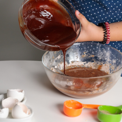 Aralashmaga eritilgan shokolad-sariyog'li aralashmani solamiz va aralashtirib olamiz.