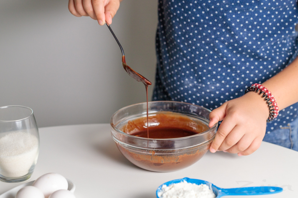 Shokolad va sariyog' solingan idishni mikroto'lqinli pechga qo'yib, suyuq holatga kirguniga qadar eritamiz.