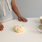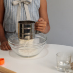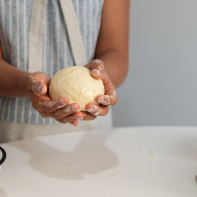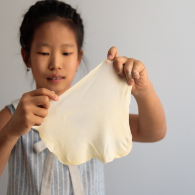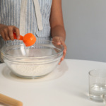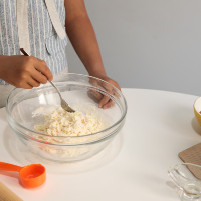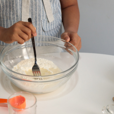 Og'irroq tog'orachaga unni solamiz (xamir qorish bolalarga osonroq bo'ladi), tuz sepib, o'rtasiga 1 osh qoshiq o'simlik yog'i va iliq suvni solamiz.