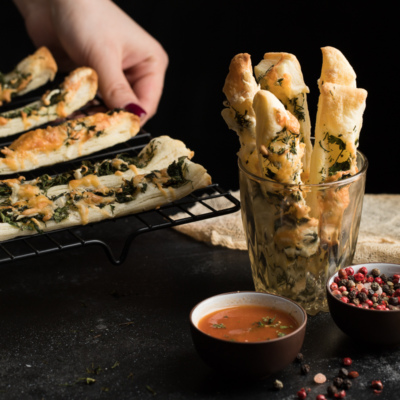 Tovuq filesiga tuz, murch va quritilgan qalampirdan sepib olamiz. Chetki qismini kesib, "cho'ntakchalar" hosil qilamiz va aralashmadan solib, chetlarini tishkovlagich yordamida berkitamiz.