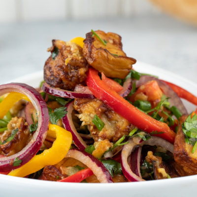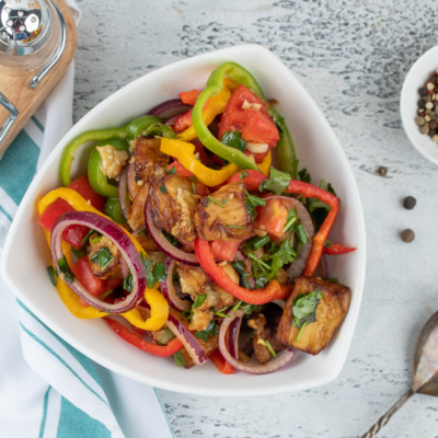 Sizga qovurilgan baqlajon, pomidor va bulg’or qalampirili ajoyib, mazali va xushta’m salat tayyorlashni taklif etamiz. Ushbu salat juda qiziqarli , shuningdek oson tayyorlanadi.