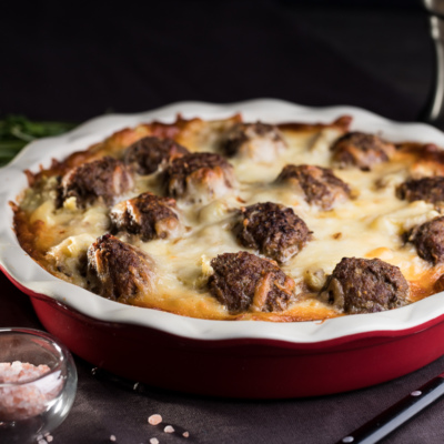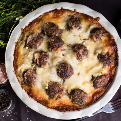 Kartoshkali pyure va pishloq bilan pishirilgan frikadelkali toblatma juda mazali ta’mda bo’lib, to’yimli tushlik yoki kechki taom bo’la oladi.