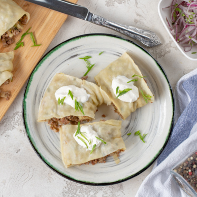 Bug’da pishirilgan ko’k piyoz va go’shtli rulet