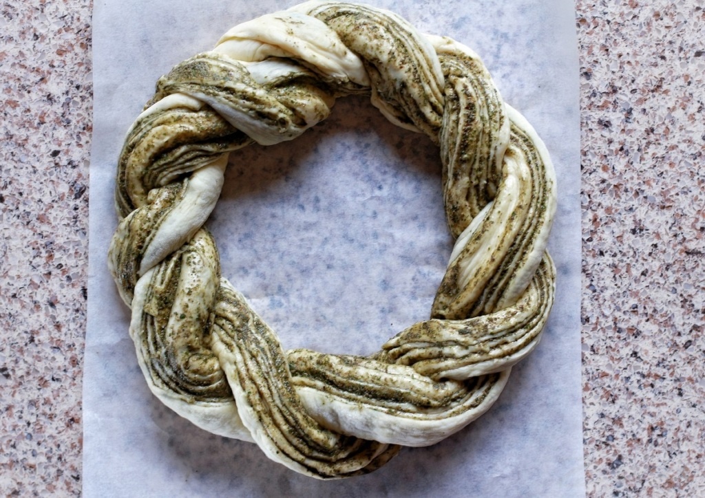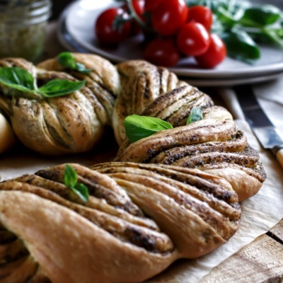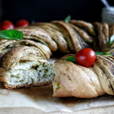 Oshirma xamirdan tayyorlaniladigan bu gulchambar, nonga ham, pirogga ham o’xshab ketadi. Bunday pishiriqni pesto qaylasi bilan pishirishga urinib ko’ring va uyingizni Italiyaning iforiga to’ldiring.