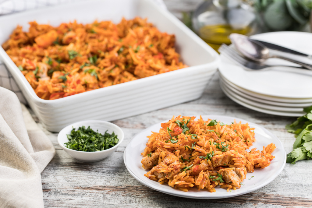 Guruch va sabzavotlar bilan pishirilgan tovuqli taom