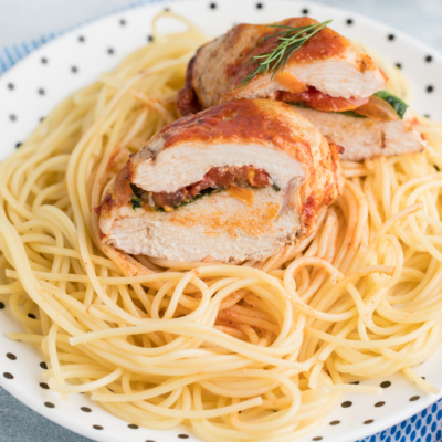 Hosil bo'lgan "cho'ntak"chalarga bir nechta pishloq bo'lagi, yupqa qilib to'g'ralgan pomidor va bir nechta ismaloq bargidan solib chiqamiz. Chetini esa tishkovlagich yordamida birlashtiramiz.