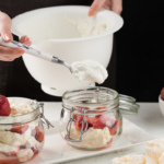 Qaymoqni esa yaxshilab ko'pirtirib olamiz.