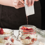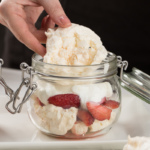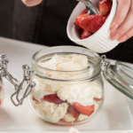 Shisha bankachalarga avval merengani bo'laklarga bo'lib solamiz, so'ng qulupnayli suvi bilan birga solib, ustidan qaymoq solib chiqamiz. Idishning uzunligiga qarab, bu jarayonni bir necha bor qaytaramiz.