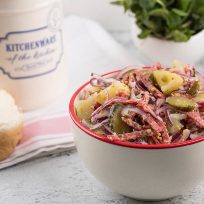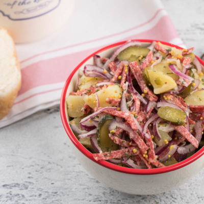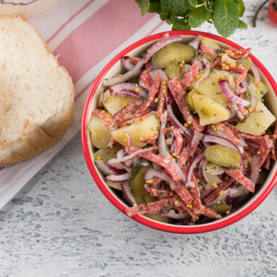 Kartoshka va kolbasali salat — juda mazali va to’yimli yegulikdir. O’z navbatida achchiqroq bo’lib, piyoz va bodring uning qarsildoqligini ta’minlab turadi)