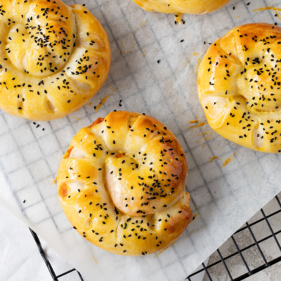 Bulochkalarni pergament qog'ozi bilan qoplangan gaz pechi patnisiga joylashtiramiz. Tuxum suritib, sedana sepamiz.