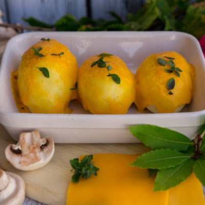 Kartoshkali kotletlarni gaz pechiga chidamli qolipga solamiz. Ustidan bir plastinkadan yumshoq pishloq qo'yamiz.