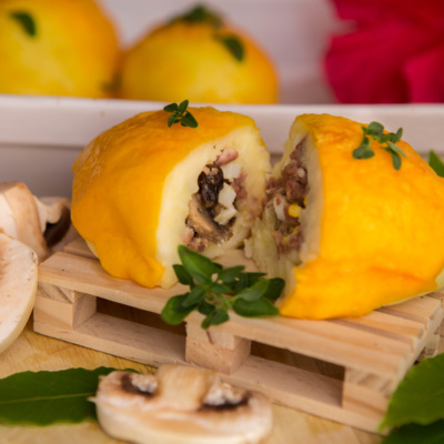 Pishgan kartoshkani boshqa idishga olamiz, ustidan sariyog'ni solib, birgalikda pyure holatiga keltiramiz. Muhim! Bu retseptda sut solinmaydi. Pyure quyuq bo'lishi kerak. Agar lozim bo'lsa, unda yarim piyolacha kartoshkani qaynagan suvidan soling.