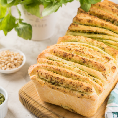 Xamir bo'laklariga pesto qaylasidan surtib, bir birining ustidan qo'yib taxlaymiz.