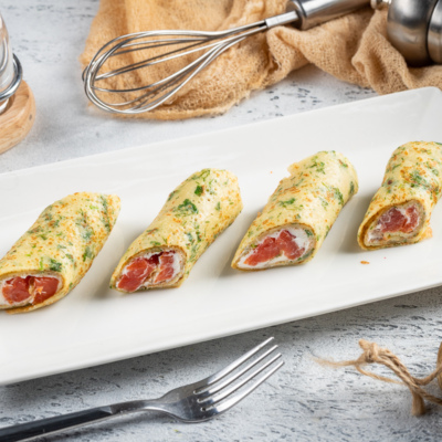 Nachinka uchun pishloqli sir va jem, qovurilgan tuxum, va dudlangan go’sht va salat barglarini ishlatdik.