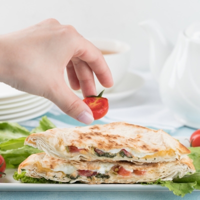 Lavash ustidan tuxumni chaqib solamiz. Pomidorni to'g'rab, pishloqni esa qirg'ichdan chiqarib solamiz. Ko'katlarni ham to'g'raymiz va masalliqlar ustiga sepamiz.