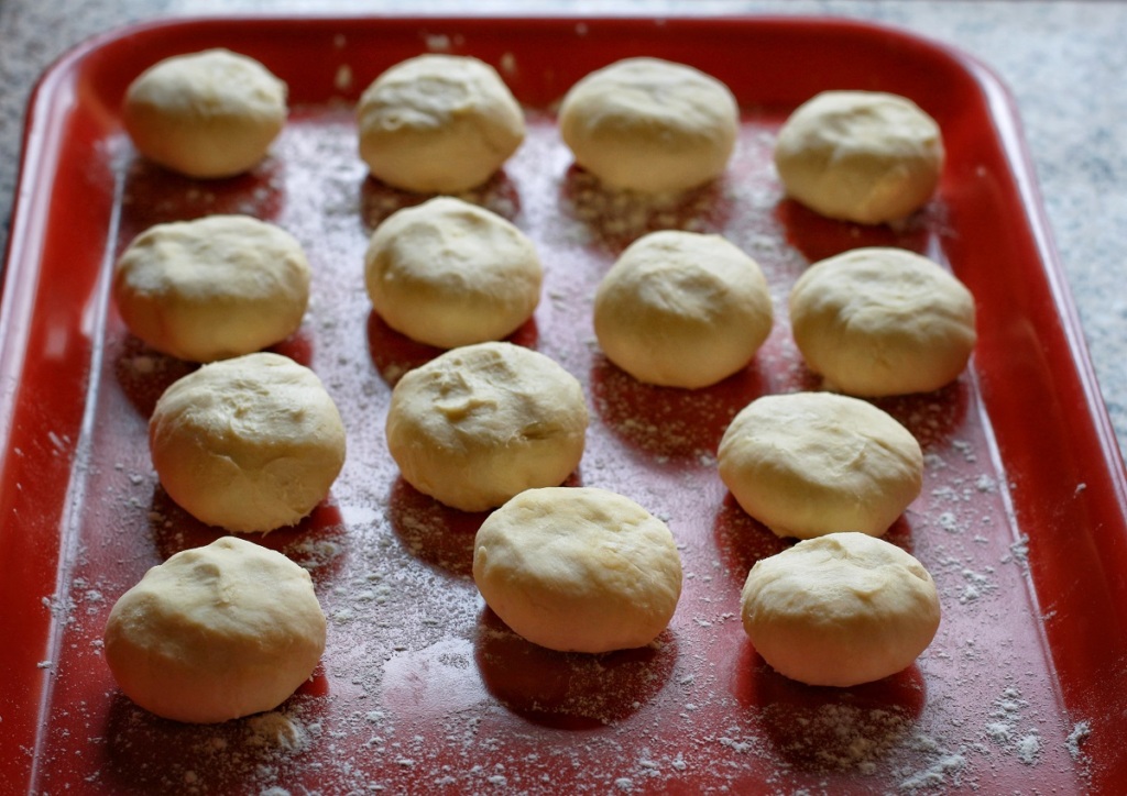 Har bir xamirchalarni koptokcha shaklga keltiramiz va kattaroq likopga un sepib, xamirlarni terib chiiqamiz.