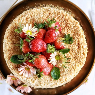 Ustini xohishga qarab bezatishingiz mumkin. Biz qulupnay va gullar bilan bezatdik. Yoqimli ishtaha!